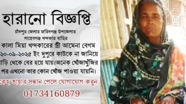 ফরিদগঞ্জে মানসিকভাবে অসুস্থ নারী নিখোঁজ, ৪ দিনেও খোঁজ নেই ফরিদগঞ্জ প্রতিনিধিঃ চাঁদপুরের ফরিদগঞ্জে নিখোঁজ আমেনা বেগমকে এখনও খুঁজে পাওয়া যায়নি। চার দিন কেটে গেলেও নেই কোনো খোঁজ। স্বজনরা এখনো অপেক্ষায়—ফিরে
