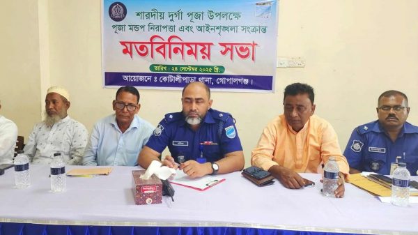 কোটালীপাড়ায় দুর্গাপূজা উপলক্ষে নিরাপত্তা ও আইন-শৃঙ্খলা সভা অনুষ্ঠিত রিকি শেখ গোপালগঞ্জ জেলা প্রতিনিধি : আসন্ন শারদীয় দুর্গাপূজা উপলক্ষে গোপালগঞ্জের কোটালীপাড়ায় নিরাপত্তা ও আইন-শৃঙ্খলা বিষয়ক এক মতবিনিময় সভা অনুষ্ঠিত হয়েছে। ২৪