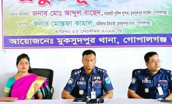 মুকসুদপুরে শারদীয় দুর্গাপূজা উপলক্ষে প্রস্তুতিমূলক সভা অনুষ্ঠিত শহিদুল ইসলাম ঃ গোপালগঞ্জ জেলার মুকসুদপুর থানার আয়োজনে আসন্ন শারদীয় দুর্গাপূজা উপলক্ষে এক প্রস্তুতিমূলক সভা অনুষ্ঠিত হয়েছে। শনিবার (তারিখ উল্লেখযোগ্য) বিকেলে থানার সম্মেলন