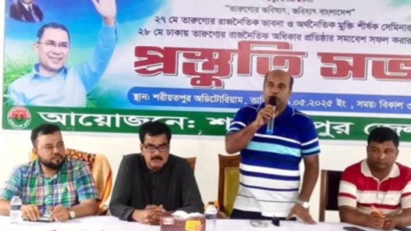 ঢাকায় তারুণ্যের সমাবেশ উপলক্ষে যুবদলের প্রস্তুতি সভা বিশেষ প্রতিনিধি:“তারুণ্যের রাজনৈতিক ভাবনা ও অর্থনৈতিক মুক্তি”শীর্ষক সেমিনার এবং ২৮ মে ঢাকায় অনুষ্ঠিতব্য তারুণ্যের রাজনৈতিক অধিকার প্রতিষ্ঠার সমাবেশকে সফল করার লক্ষ্যে শরীয়তপুরে যুবদলের