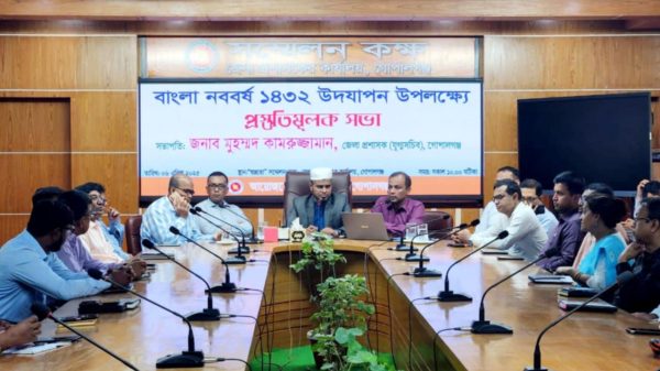 বাংলা নববর্ষ -১৪৩২ উদযাপন উপলক্ষে গোপালগঞ্জে প্রস্তুতিমূলক সভা অনুষ্ঠিত কাজী ফারদীন রহমান, গোপালগঞ্জঃ বাংলা নববর্ষ -১৪৩২ উদযাপন উপলক্ষে গোপালগঞ্জে প্রস্তুতিমূলক সভা অনুষ্ঠিত হয়েছে। গোপালগঞ্জ জেলা প্রশাসনের আয়োজনে রোববার (৬ এপ্রিল)