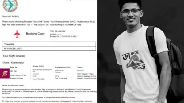 টিকিট পেলেও প্রবাসে যাওয়া হল না রুবেলের মোঃনাঈম হোসেন পলোয়ান (ফরিদগঞ্জ থেকে)ঃ আকাশছোঁয়া স্বপ্ন আর বুক ভরা আশা নিয়ে প্রবাসের উদ্দেশ্যে গত ১১ ফেব্রুয়ারী মালয়েশিয়া যাওয়ার জন্য বিমানে ওঠার কথা