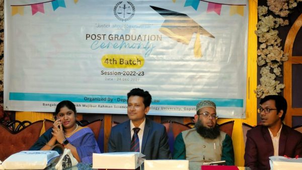 বশেমুরবিপ্রবিতে আইন ৪র্থ ব্যাচের বিদায় সংবর্ধনা সম্পন্ন কে এম সাইফুর রহমান, নিজস্ব প্রতিনিধিঃ গোপালগঞ্জের বঙ্গবন্ধু শেখ মুজিবুর রহমান বিজ্ঞান ও প্রযুক্তি বিশ্ববিদ্যালয়ের (বশেমুরবিপ্রবি) আইন বিভাগের চতুর্থ ব্যাচের শিক্ষার্থীদের বিদায় সংবর্ধনা