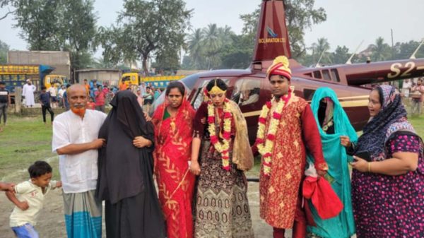 বর রেখে হেলিকপ্টার দেখতে উৎসুক জনতার ভীড় আকাশ আহম্মেদ সোহেল, মাদারীপুর প্রতিনিধি: মাদারীপুরের রাজৈরে বাবা-মায়ের ইচ্ছা পূরণ করতে হেলিকপ্টারে চড়ে বিয়ে করতে যান ইতালি প্রবাসী যুবক লালচাঁন মিয়া। বিয়ে শেষে স্ত্রীকে নিয়ে বাড়ি