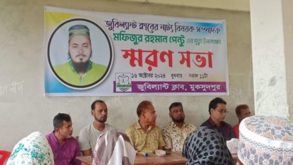 মুকসুদপুরে নাট্য ব্যক্তিত্ব পেন্টুর স্মরণ সভা মুকসুদপুর (গোপালগঞ্জ) প্রতিনিধিঃ গোপালগঞ্জের মুকসুদপুর জুবিল্যান্ট ক্লাবের নাট্য বিষয়ক সম্পাদক নাট্য ব্যক্তিত্ব মফিজুর রহমান পেন্টু মিয়ার মৃত্যুতে ১৯ অক্টোবর শনিবার সকাল সাড়ে ১০টায় মুকসুদপুর
