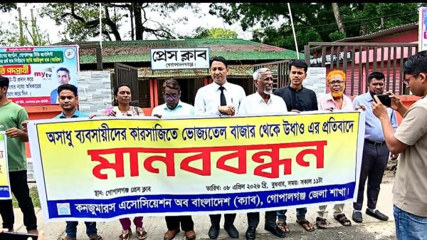গোপালগঞ্জে কৃত্রিম সংকট তৈরি করে ভোজ্য তেলের মূল্য বৃদ্ধির প্রতিবাদে ক্যাব-এর মানববন্ধন